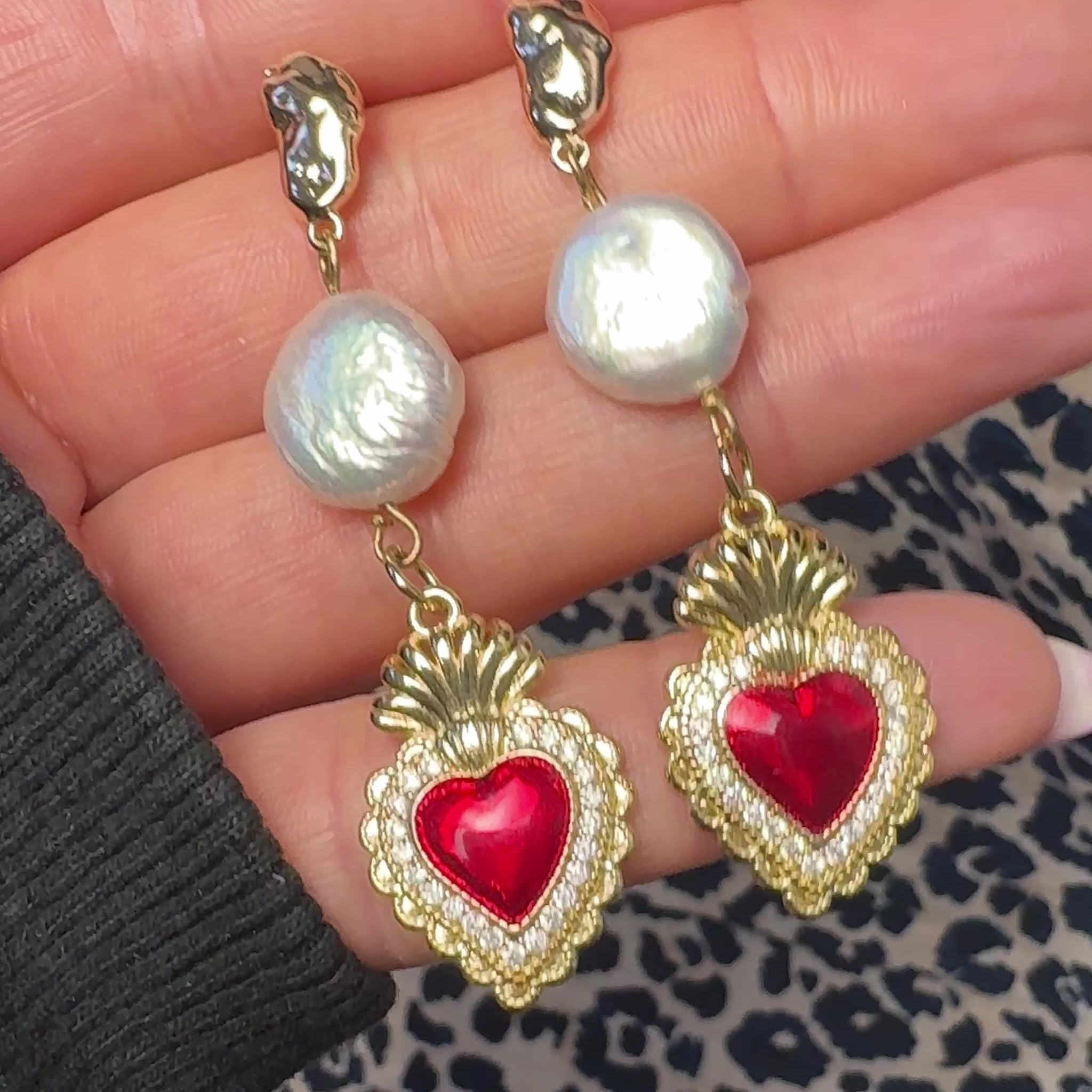 made with genuine freshwater pearls, glossy deep red enamel hearts and plated with 18k gold for a luxuriously shiny finish