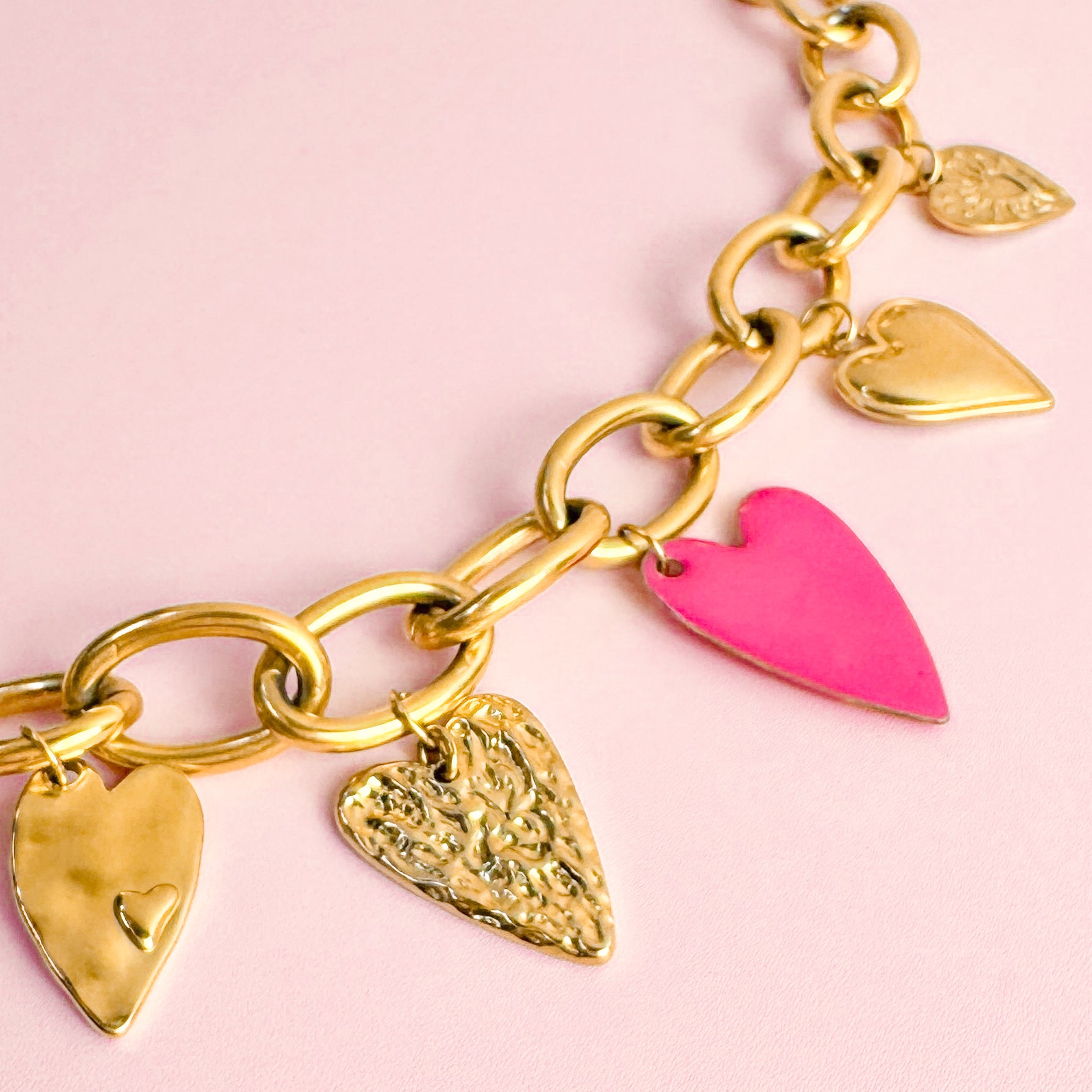 Make a statement with your jewels - our latest chunky gold charm necklace, Marnie, holds five gorgeous heart charms, with a perfect link enamel heart and its centre.